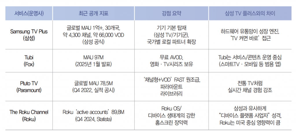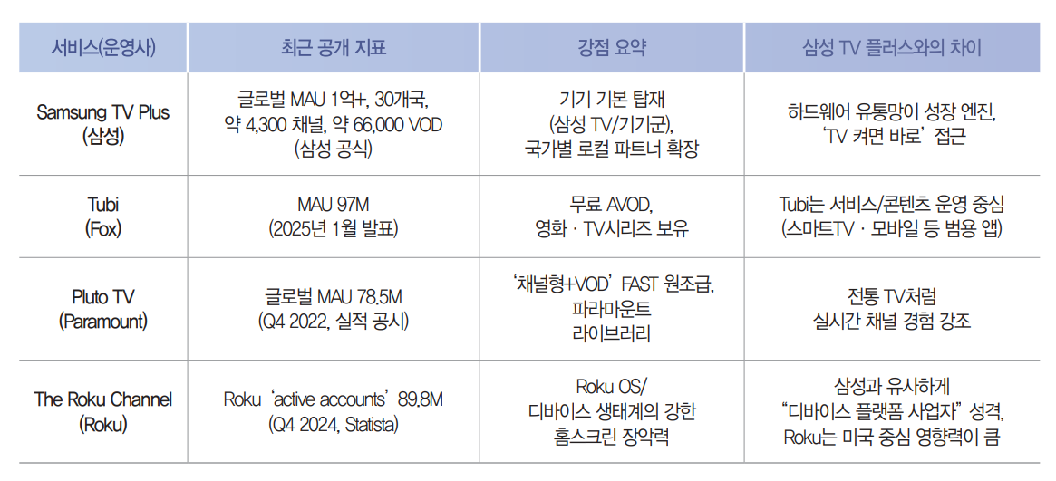 경쟁 FAST 서비스로는 Tubi(폭스), Pluto TV(파라마운트), The Roku Channel(로쿠) 등이 대표적이며, 삼성의 장점은 “삼성 TV(기기) 생태계에 기본 탑재되는 배포력”에 있다. 반대로 단점은 기기 외부(비삼성 단말) 확장성, 콘텐츠 차별화(오리지널·독점), 광고 측정/검증 표준을 얼마나 신뢰성 있게 구축하느냐가 플랫폼 가치의 상한선을 결정한다는 점이다.