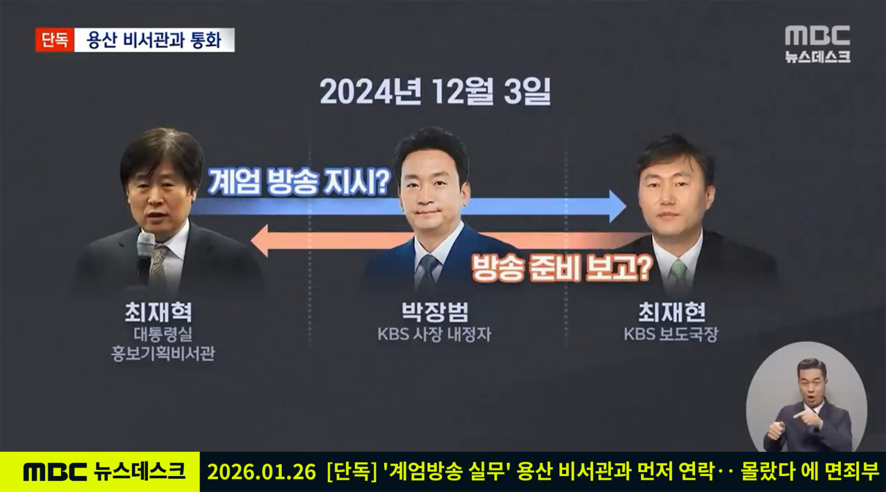 앞서 전국언론노동조합 KBS본부는 1월 26일 ‘KBS 사장 12‧3 내란방송 개입 의혹 관련 기자회견’을 통해 “믿을 만한 취재원을 통해 박장범 당시 사장 내정자가 최재현 통합뉴스룸 국장(보도국장)에게 전화를 걸었다는 것을 확인했다”며 대통령실과 KBS 사이 ‘계엄 생방송’ 연결고리로 박 사장을 지목했다.