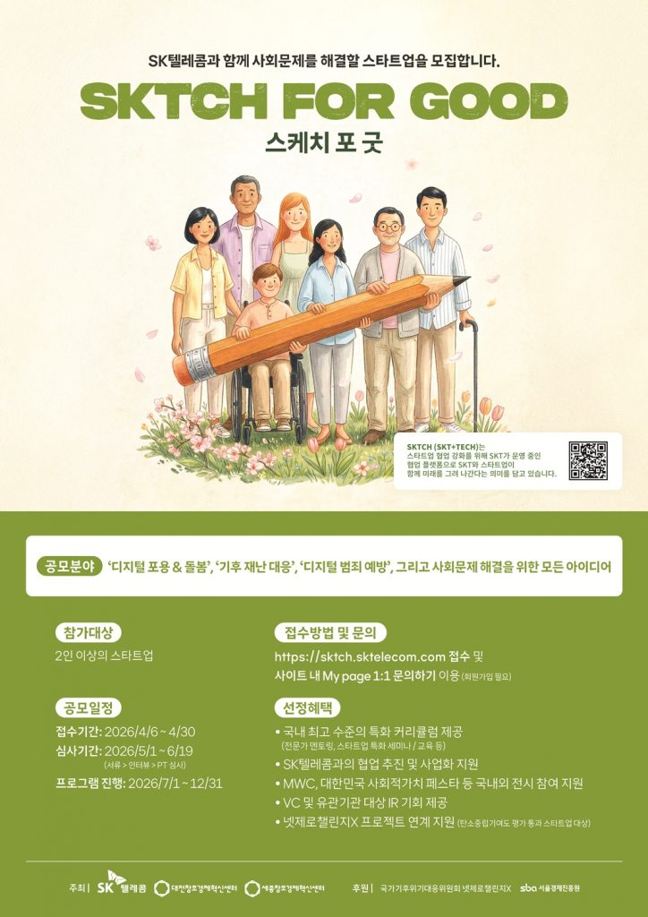 [방송기술저널 백선하 기자] SK텔레콤이 차세대 ESG 스타트업 발굴·육성 프로그램 ‘SKTCH for Good(스케치 포 굿)’을 론칭하고, 4월 30일까지 참여 스타트업을 모집한다고 7일 밝혔다.