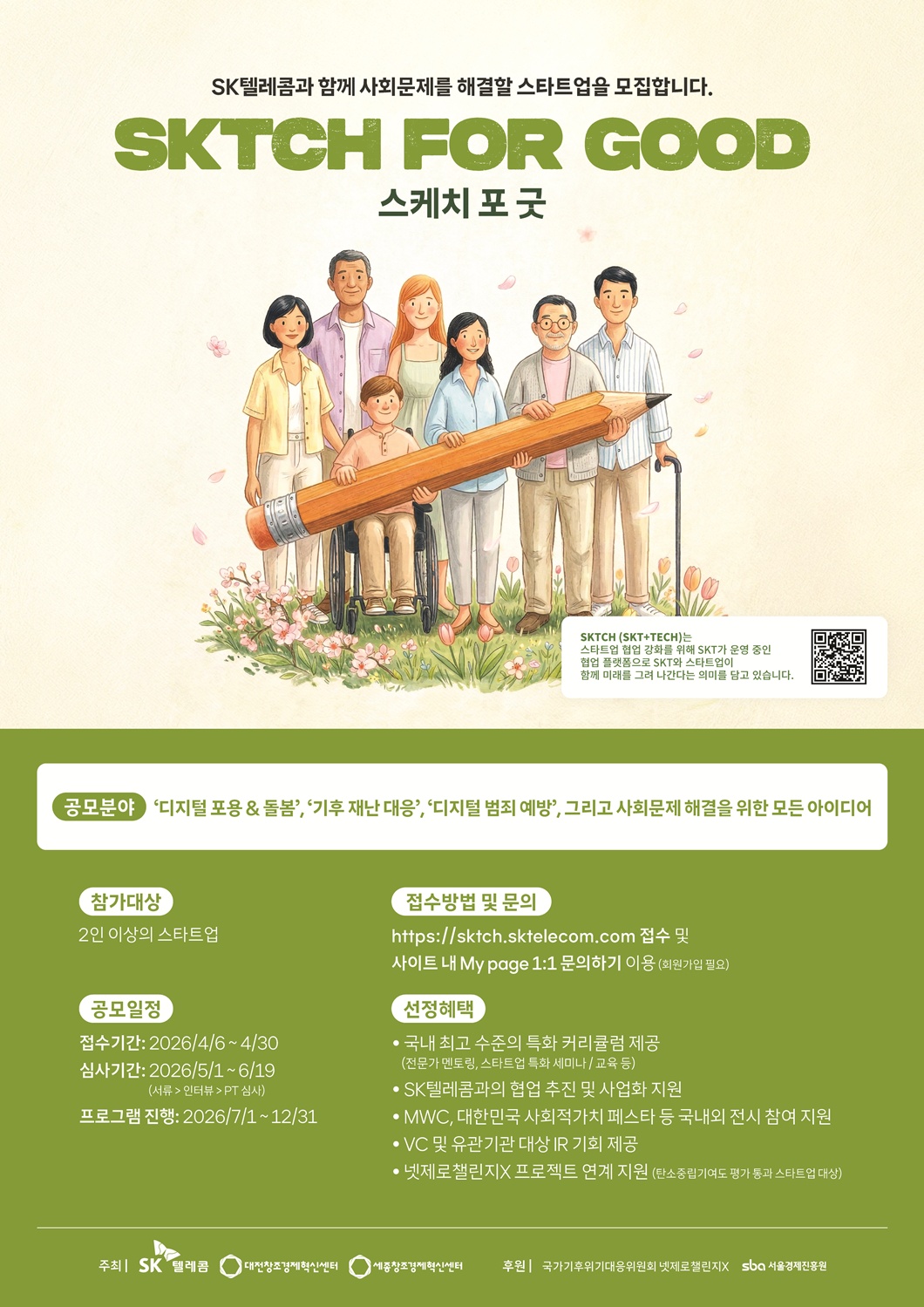 SK텔레콤은 ‘SKTCH for Good’을 통해 ESG 분야 스타트업과 함께 사회·환경 문제 해결에 나선다는 방침이다. 디지털 포용·돌봄, 기후 재난 대응, 디지털 범죄 예방 등 향후 중요성이 커질 것으로 예상되는 영역을 중심으로, 혁신적인 ESG 설루션을 보유한 스타트업 15개사를 선발할 계획이다.